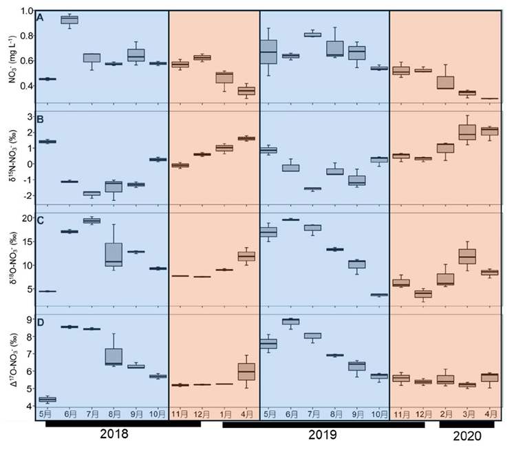 图2 2018年5月至2020年4月枪勇湖水中NO3-浓度(A)及同位素组成(B-D)的月变化特征。蓝色和橙色分别代表消融期和非消融期。