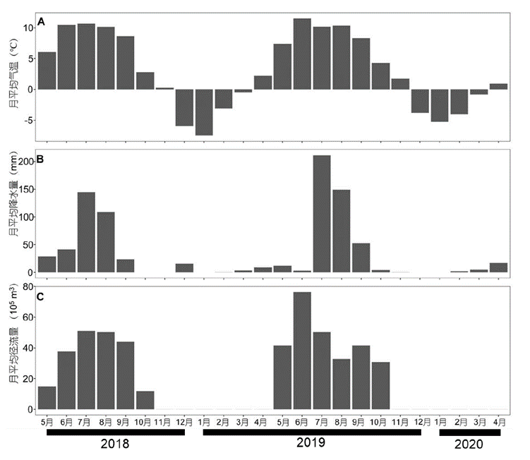 图1 2018年5月至2020年4月枪勇流域月平均气温(A)、降水量(B)及径流量(C)。