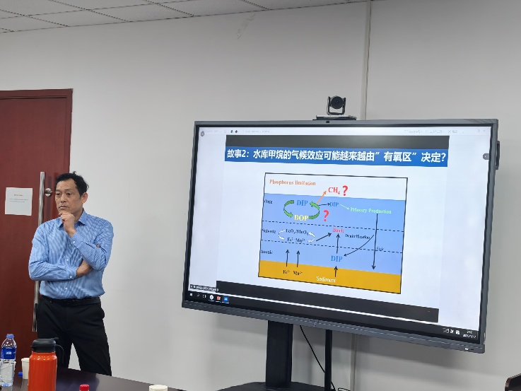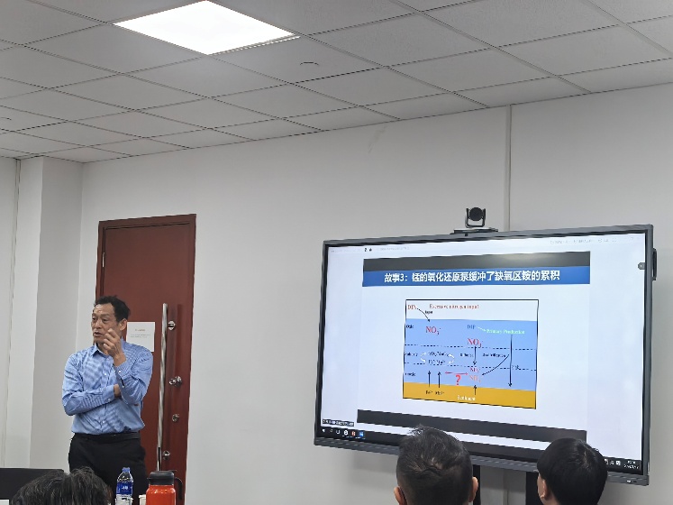 本次讲座从多元素耦合视角出发,探讨了氧化还原敏感元素(铁和锰)介导的元素循环(碳、氮和磷)及其气候效应。报告结束后,与会师生围绕溶解性有机磷的形成与转化机制、有氧水体中CH4产生的温度敏感性、CH4产生途径及其环境控制因素、微生物在铁、锰吸附–解析附过程中的作用等方面进行了深入交流与讨论。