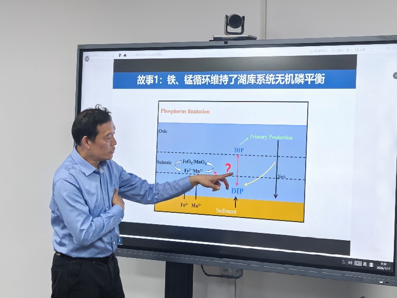 报告主体围绕三项研究工作系统展开。在“铁、锰循环如何调控湖库系统无机磷平衡”这一部分,高树基教授以水库分层期观测到的氨–磷解耦现象为切入点,指出在层化增强、底层水体缺氧加剧的过程中,铵浓度持续积累,而水体无机磷浓度却呈现降低的趋势。研究表明,缺氧条件下锰氧化物的形成及其对无机磷的高效吸附,是导致铵与无机磷变化趋势分离、进而产生氨–磷解耦的重要机制,并指出该过程通过调控无机磷的有效性,对水体初级生产力及营养盐平衡具有重要生态意义。