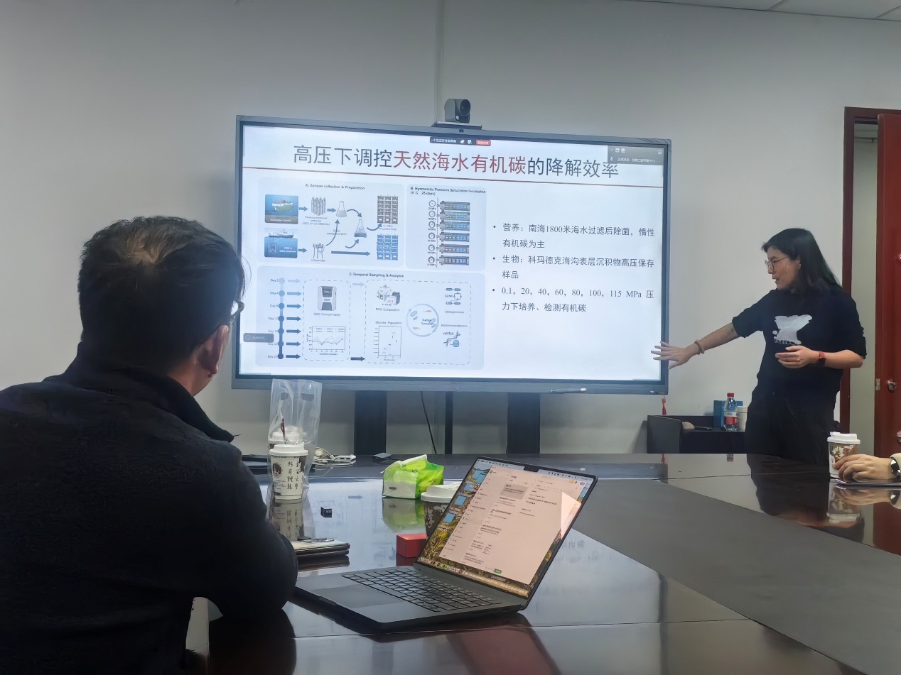 随后,张宇研究员重点介绍了团队利用这些装备在深海微生物碳氮循环功能研究中取得的的主要成果。研究发现,在高压条件下,微生物可同时利用氧气和硝酸根作为电子受体,导致一氧化二氮的积累。这一发现表明,高静水压可能通过改变深海生物地化学反应分区,进而重塑区域元素循环过程;此外,反硝化作用可能导致深渊氮素的损失,进一步加剧深渊环境的氮限制。这一研究对修正现有的海洋碳氮循环模型具有重要的意义。此外,张宇研究员还阐述了高压环境下微生物代谢的新机制,涉及惰性溶剂性有机碳(RDOC)的转化以及生命活动的能量效率调控。这些新机制解释了深海微生物如何在极低能量供给下维持高效的碳库周转。